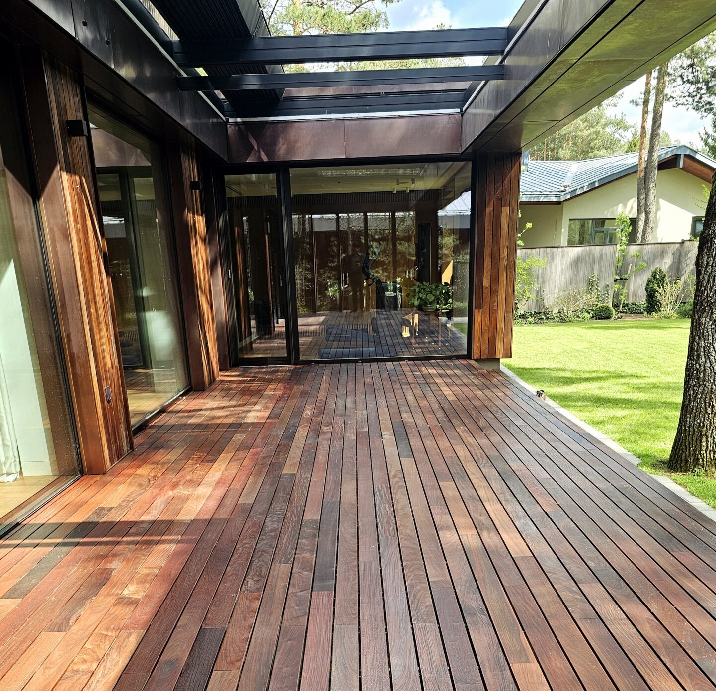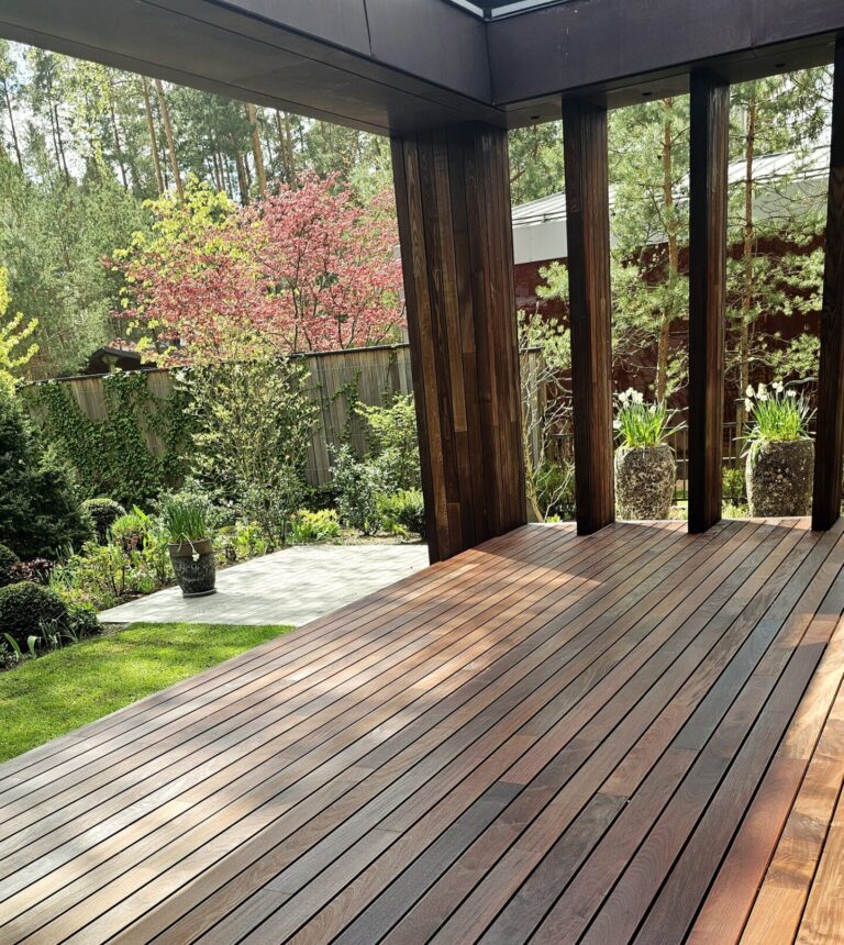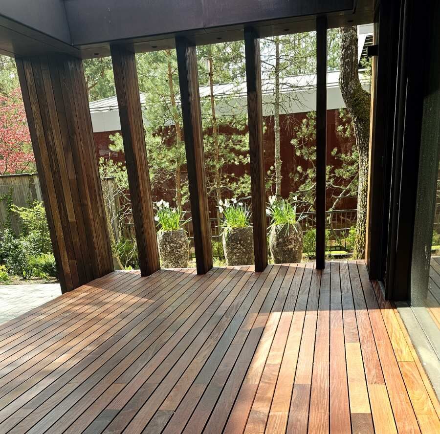 Terasos projektas įgyvendintas naudojant Softline terasų sistemą ir IPE medieną. Natūrali mediena suteikia jaukumo, o sistema užtikrina tvarkingą ir patvarų sprendimą.